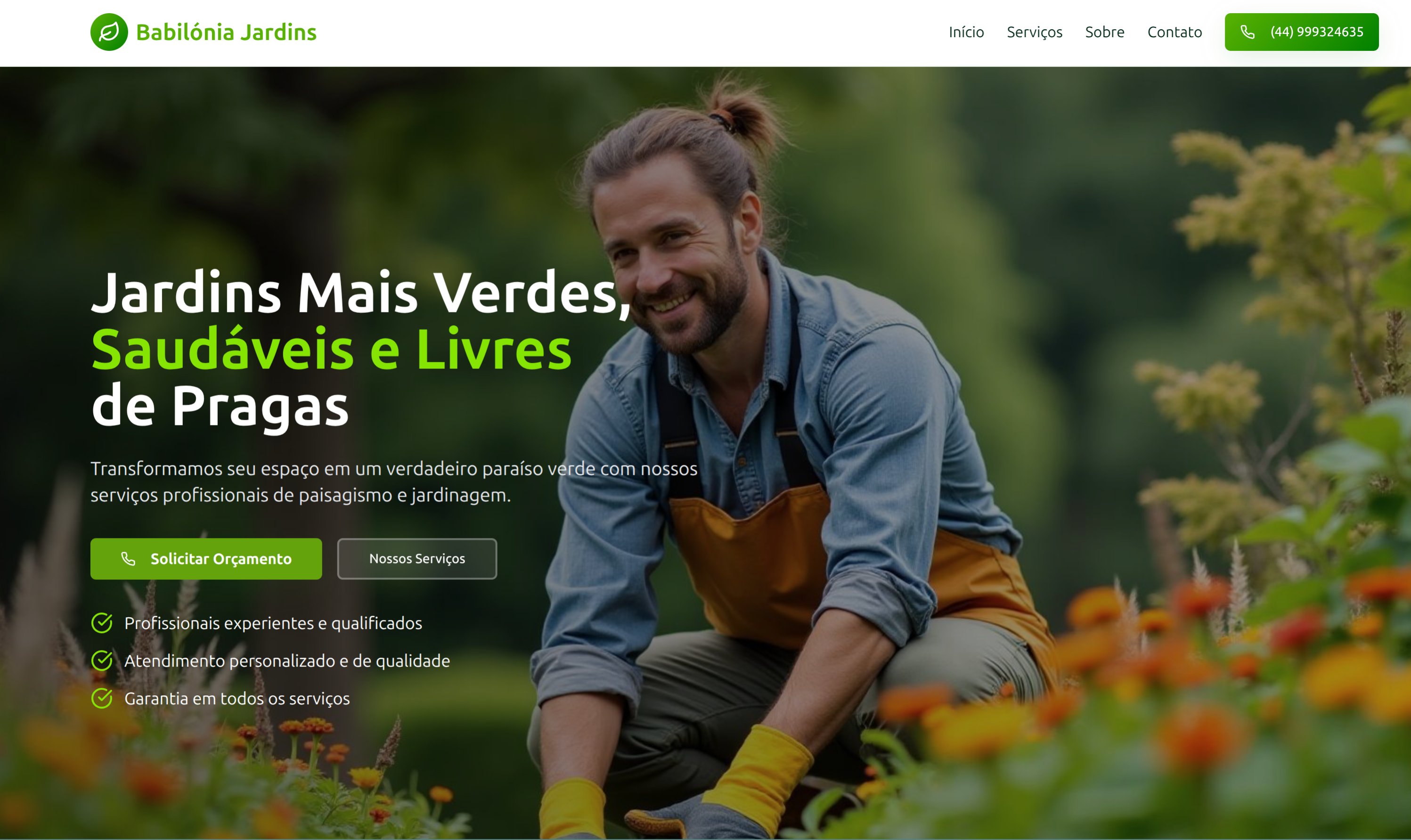 Site moderno e profissional para empresa de paisagismo e jardinagem, com fotografia autêntica de serviços, design clean em tons de verde e foco em jardins saudáveis e livres de pragas.