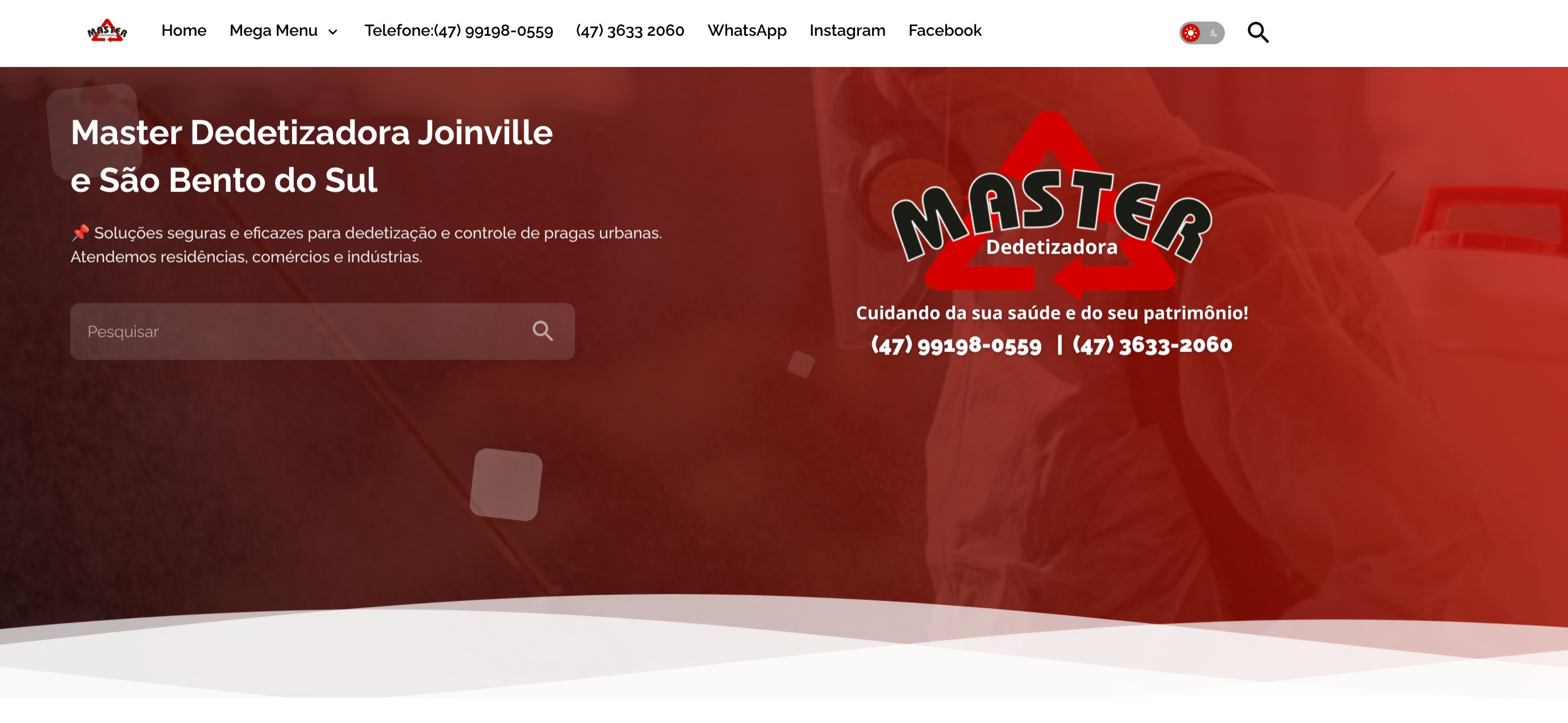 Site profissional para empresa de dedetização e controle de pragas urbanas em Joinville e São Bento do Sul, com design moderno em tons de vermelho e funcionalidade de busca integrada.